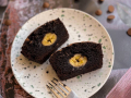 Затем переверните пирог на тарелку и удалите пекарскую бумагу.