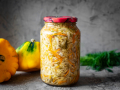 Помидоры, маринованные с патиссонами на зиму, готовы к хранению.