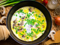 Добавьте яичную смесь к овощам. Прикройте сковороду крышкой и готовьте блюдо еще 7-10 минут, пока смесь слегка не загустеет.