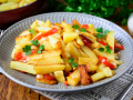 Готовый картофель приправляют ароматной заправкой на основе чеснока, большого количества зелени и пряных специй – эта ароматная приправа и является изюминкой данного блюда, поскольку, обволакивая каждый золотистый ломтик картофеля, придает ему невероятно соблазнительный пряный вкус. Обязательно попробуйте!