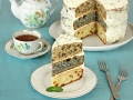 Собираем торт, для чего разрежем вдоль коржи, чтобы у нас получилось по два маковых и шоколадных коржа. Шоколадный корж укладываем на блюдо и смазываем кремом. Сверху посыпаем измельченными орешками. Далее укладываем маковый, на него - крем, после опять шоколадный, сверху - крем и орешки. Получается, что орехами мы посыпаем крем на шоколадных коржах, а также оставляем для обработки боков торта. Последним будет маковый корж. Смажем верх и бока кремом и поставим торт в холодильник, чтобы крем стабилизировался.