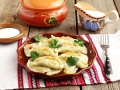 Переверните бризоль фаршем вверх, выложите обжаренные грибы с луком, сложите пополам и дайте грибам немного прогреться.