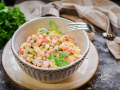 Креветок очистите от панциря и кишечника, нарежьте таким же мелким кубиком, переложите в миску.