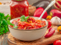 Наполните баночки мякотью баклажана и сверху добавьте еще одну разрезанную пополам помидорку.