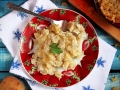 В уже готовые макароны выдавим через пресс чеснок, перемешаем и через минуту снимем сковороду с плиты.