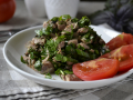Готовый острый салат с говядиной и чесночными стрелками разложим по порционным тарелкам и подадим к столу, украсив свежей зеленью по вкусу.