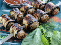 Сверните баклажаны рулетиком. Таким образом сверните все пластины, пока не закончится начинка.