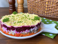 Выложите салат горкой на тарелку. Вторую свеклу очистите и нарежьте тонкими пластинками. Каждую пластинку разрежьте пополам. Выложите половинки пластинок по кругу салата, имитируя лепестки розы.