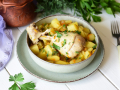 Съели бульон с лапшой - накладываем с общего блюда в те же тарелки себе курицу с картошкой. Обед удался на славу! Все сыты и довольны!