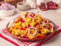 Нашинковать полукольцами репчатый лук. В рукав к картофелю положить куриное филе и лук.