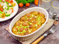 Запекайте картофель с черносливом в духовке 35-40 минут при 180°С. Форму прикройте фольгой, чтобы чернослив не пригорел. Да и картофель лучше пропечется и получится мягким.