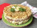 Последним слоем будет тертый сыр. Теперь аккуратно снимите с салата сервировочное кольцо и поставьте его немного охладиться в холодильник.