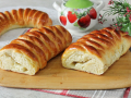 Вторую часть теста также раскатайте в прямоугольный пласт. Выложите на его середину рулет с черешней. По бокам сделайте надрезы, как на фото.