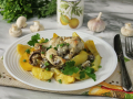 Курицу с кабачками и грибами (шампиньонами) выложите на тарелку и подавайте к столу. Приятного аппетита!