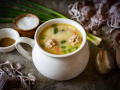 Соберите ингредиенты для приготовления сырного супа с креветками и грибами (шампиньонами).