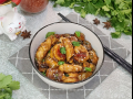 Время соуса. Убавьте нагрев до среднего, тщательно перемешайте соус, прежде чем вылить в сковороду, поскольку крахмал оседает на дно. Соус практически сразу начинает густеть. Проварите все вместе 2-3 минуты, добавьте зелёный лук, перемешайте, и наши кальмары в кисло-сладком соусе готовы!