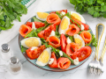 Все ингредиенты вы можете остудить до комнатной температуры или использовать в тёплом виде. На мой взгляд, когда ингредиенты тёплые, салат получается ярче по вкусу. Безусловно, речь идёт о тех ингредиентах, которые подвергались термической обработке. Помидоры и оливки подогревать не следует.