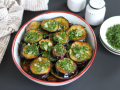 Баклажаны помойте, обрежьте плодоножку, наколите и выложите на тарелку. Запекайте в микроволновке 5 минут при мощности 750 ватт. Или в духовке - 30-35 минут. После баклажаны охладите и очистите.