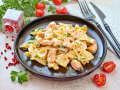 Пасту отварите согласно инструкции на упаковке. Перед тем как откинуть пасту на сито, зачерпните 150-200 мл той воды, в которой она варилась. Пасту, не промывая, добавляем в соус. Перемешиваем пасту с соусом, и если блюдо кажется вам недостаточно сочным, добавьте той самой воды от варки пасты)).