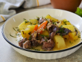Перед запеканием очистите и нарежьте картофель дольками. Слегка приправьте его солью. Добавьте к картофелю оставшуюся 1/3 маринада из соуса терияки.