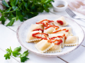 Выложите на тарелку равиоли и полейте горячим сливочным соусом. По желанию украсьте равиоли с семгой в сливочном соусе зеленью, и можно подавать к столу. Приятного аппетита!