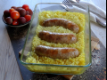Если любите специи и пряности, то добавляйте их в небольшом количестве и только в гарнир, так как сами колбаски уже просолены и специи - внутри них, в фарше.