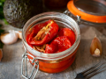 Вяленые томаты бывают разные. Одни, как у меня, просто вяленые, приправленные небольшим количеством соли. Я вялила их сама в электросушилке. Другие вяленые томаты продаются в банках, они залиты маслом. Так вот, если у вас томаты без масла, то они могут быть суховаты, поэтому их лучше предварительно залить тёплой водой на 10 минут. А те вяленые томаты, которые в масле, довольно влажные, их достаточно просто вынуть из масла и можно использовать.