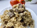 Перед подачей к столу рисовый слой перемешать с мясным. Выложить плов на большое блюдо. Отварные яйца разрезать пополам и выложить вокруг плова.