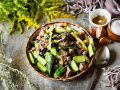 В салатник положите все нарезанные продукты, добавьте маринованный лук, мелко нарезанный чеснок.