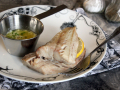 Переложите паровую сельдь вместе с морковью на тарелку и дополните ломтиком лимона.