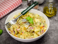 Я собирала салат в кольце, можно делать просто в глубокой тарелке/салатнике.