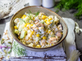 Салат с рисом и овощами готов. Подавайте на закуску.