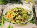 Параллельно отварите рис. Хорошо помойте его, выложите в кастрюлю и залейте водой в соотношении риса к воде 1:3, посолите по вкусу. Варите до готовности, после откиньте на дуршлаг и промойте кипяченой водой.