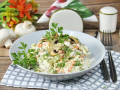 Смешайте все ингредиенты салата в глубокой миске, добавьте маленькую щепотку соли (лучше потом досолить, чем сразу пересолить) и майонез.