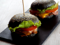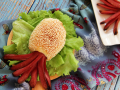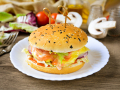 Прикройте бургер с сосиской второй половинкой булочки и зафиксируйте композицию бамбуковой или другой шпажкой. Готово! Приятного!