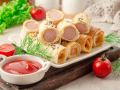 Для начинки я использовала мини-сосиски. Сосиски почистите и разрежьте вдоль пополам. Сковороду смажьте растительным маслом, разогрейте, отправьте туда сосиски, обжаривайте с двух сторон по 1-1,5 минутки, чтобы подрумянились и получились более ароматными.