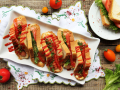 Добавьте кружочки помидоров и завершите все это дело сыром - выложите пластинки поверх всей начинки.