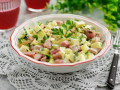 Салат полейте майонезом, посолите и поперчите по вкусу. Майонез можете заменить сметаной или йогуртом.
