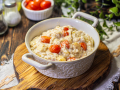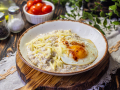 Соберите необходимые продукты для приготовления томатной овсянки с яйцом. Вам понадобится небольшой и простой набор продуктов, который есть в наличии у каждой хозяйки. В своём рецепте я использовала готовый томатный соус с базиликом, но если такого нет, то возьмите перетертые консервированные или свежие томаты. Творожный сыр придает каше сливочность и кремовую текстуру. Яйцо пашот можете приготовить по своему методу или заменить на отварное либо жареное яйцо.