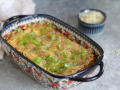 Форму для запекания смажьте сливочным (или растительным) маслом и вылейте в неё всю зеленую омлетную смесь.