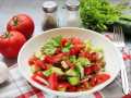 Овощной набор можно менять по сезону и наличию. У меня стандартные огурчик-помидорчик, но в этот салат подойдут любые овощи, которые едят сырыми. К примеру, огурец замените на молоденький цуккини, а помидор - на сладкий перец.