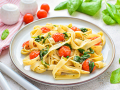 Соберите необходимые продукты для приготовления макарон с кабачками и баклажанами. Форму макаронных изделий выберите на ваше усмотрение, желательно, чтобы они были из твердых сортов пшеницы. Я приготовила вариант из летних сезонных овощей, в не сезон можно заменить свежие овощи замороженными.