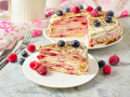 На верхний корж отсадить крем и украсить ягодами (у меня клубника и вишня), ещё использовала несколько листиков мяты.