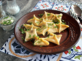 Часть теста раскатайте в пласт толщиной 2-3 мм. С помощью круглой выемки нарежьте небольшие кружки, диаметром 6-7 сантиметров. В каждый выложите чайную ложку рыбной начинки. Так поступите со всем тестом и начинкой.