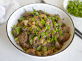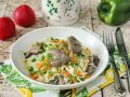 Сметану разведите в воде и этой смесью залейте печенку с овощами. Посолите и поперчите по вкусу.