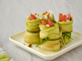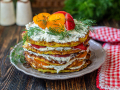 Так собираем весь торт. Верх украшаем свежей зеленью, помидорами черри (или верхушками помидоров). Убираем в холодильник минимум на час, чтобы кабачковые блинчики пропитались соком и ароматом из начинки.