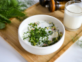 В кастрюлю с нарезанными ингредиентами налейте кефир, посолите и поперчите по вкусу. Можно поступить иначе. Сухую смесь разложите по тарелкам, залейте кефиром и квасом, пропорции которых берите по вкусу.