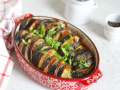 Корзину аэрогриля застелите пергаментом или выложите вкладыш. Выложите баклажаны в чашу аэрогриля в один слой.