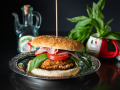 На помидор можно также положить салат и прикрыть верхней частью булочки.