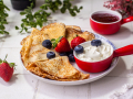 Жарьте блины на огне чуть выше среднего до румяности поочередно с обеих сторон. Блинчики очень нежные, чтобы было удобнее их переворачивать, используйте сковороду небольшого диаметра с хорошим антипригарным покрытием.